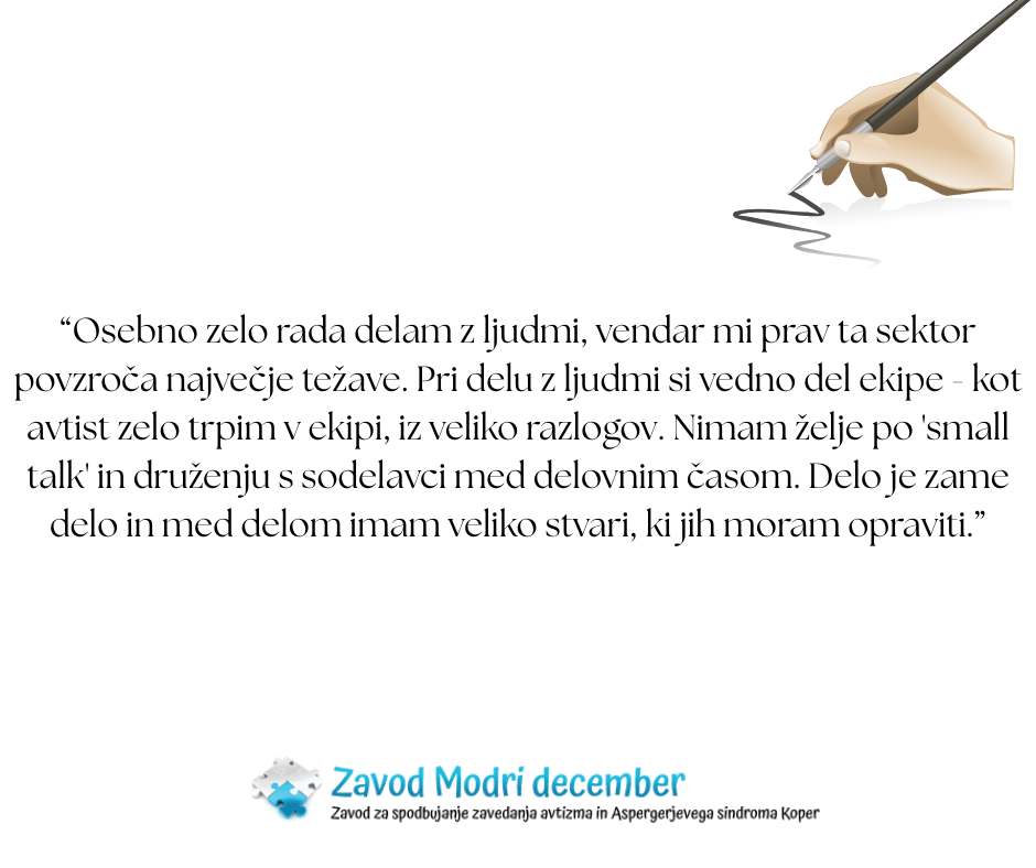Osebno zelo rada delam z ljudmi, vendar mi prav ta sektor povzroča največje težave. Pri delu z ljudmi si vedno del ekipe – kot avtist zelo trpim v ekipi, iz veliko razlogov. Nimam želje po ‘small talk’ in druženju s sodelavci med delovnim časom. Delo je zame delo in med delom imam veliko stvari, ki jih moram opraviti. Zapravljanje časa za opravljanje in nesmiselne pogovore, mi vzame dragoceno energijo in odreže čas, katerega bi porabila za ‘stranke, otroke, mladoletnike’ za katere sem v službi. Zaradi nepovezovanja s sodelavci, sem bila obtožena vzvišenosti, občutka večvrednosti, nesramnosti in veliko drugih stvari. Zanimivo pa je, da sem se z nekaterimi sodelavci, ki so sodelovali pri delu zelo povezala, saj uspeš med aktivnim delom spoznati osebo dobro. Za to ne potrebuješ zapravljanja časa na čik pavzi in predolgem kosilu. Posledično menim, da se mora vodja seznaniti z avtizmom in takoj zatreti kakršne koli govorice in opravljanje avtistične osebe s strani sodelavcev.