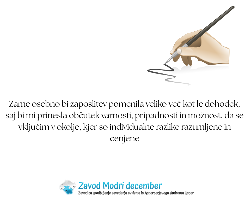 »Zame osebno bi zaposlitev pomenila veliko več kot le dohodek, saj bi mi prinesla občutek varnosti, pripadnosti in možnost, da se vključim v okolje, kjer so individualne razlike razumljene in cenjene. V takšnem okolju bi lahko brez pritiska izrazila svoje mnenje, pokazala znanje, veščine in spretnosti po svojih najboljših zmožnostih.