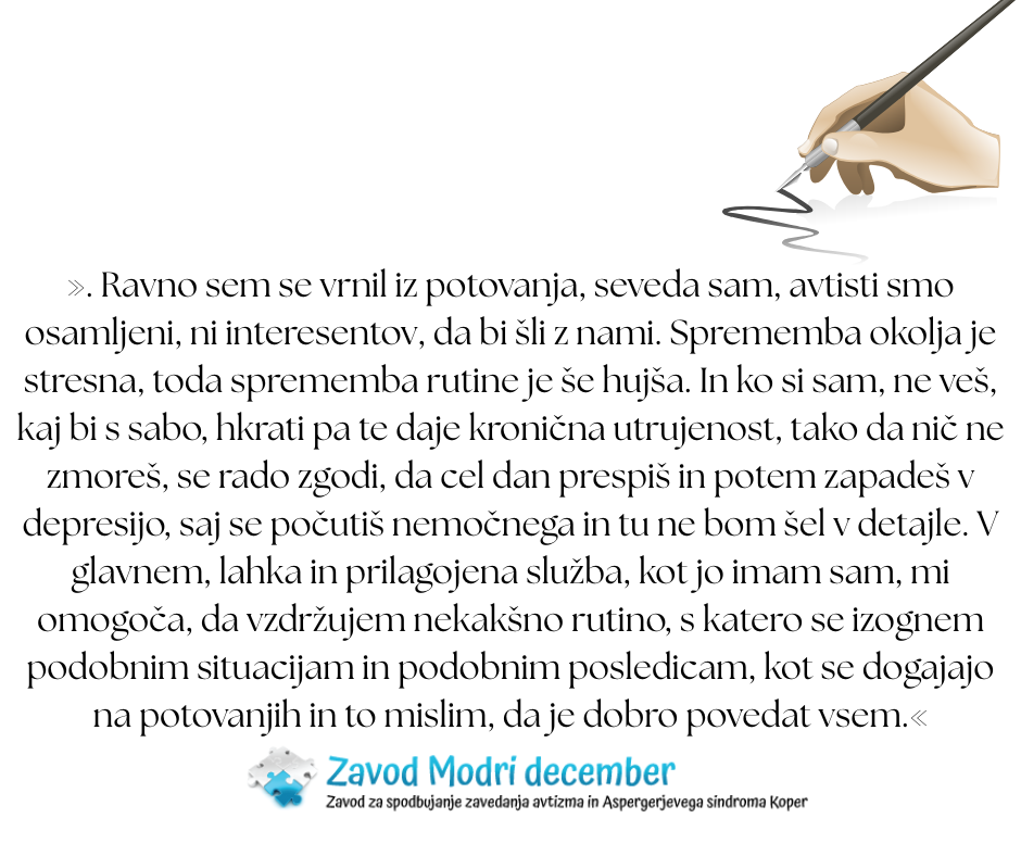 »Torej, kaj mi pomeni zaposlitev? Pomeni mi predvsem večjo samozavest, večji občutek sprejetosti pa tudi možnost skromnega zaslužka. Seveda pa, to je treba povedat, opravljam delo, ki je zelo prilagojeno mojemu zdravstvenemu stanju. Tudi delam zgolj po 4h. Žal regularnega (op.p. 8 urnega delovnika) dela ne bi zmogel opravljat. Rad bi pa povedal še nekaj, kar se z delom tiče samo posredno, a po drugi strani tudi pojasni pomen dela za človeka, kot sem jaz. Ravno sem se vrnil iz potovanja, seveda sam, avtisti smo osamljeni, ni interesentov, da bi šli z nami, vsako leto isto pač in dopust je vedno sladko grenek. Sprememba okolja je stresna, toda sprememba rutine je še hujša. In ko si sam, ne veš, kaj bi s sabo, hkrati pa te daje kronična utrujenost, tako da nič ne zmoreš, se rado zgodi, da cel dan prespiš in potem zapadeš v depresijo, saj se počutiš nemočnega in tu ne bom šel v detajle, saj jih je težko pojasnit. V glavnem, lahka in prilagojena služba, kot jo imam sam, mi omogoča, da vzdržujem nekakšno rutino, s katero se izognem podobnim situacijam in podobnim posledicam, kot se dogajajo na potovanjih in to mislim, da je dobro povedat vsem.«